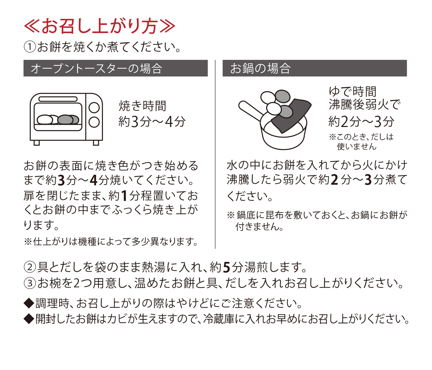 | 栄養成分表示 2人前(もち含む)当たり/ エネルギー428kcal/ タンパク質15.1g/ 脂質2.9g/ 炭水化物81.9g/ 食塩相当量3.6g |