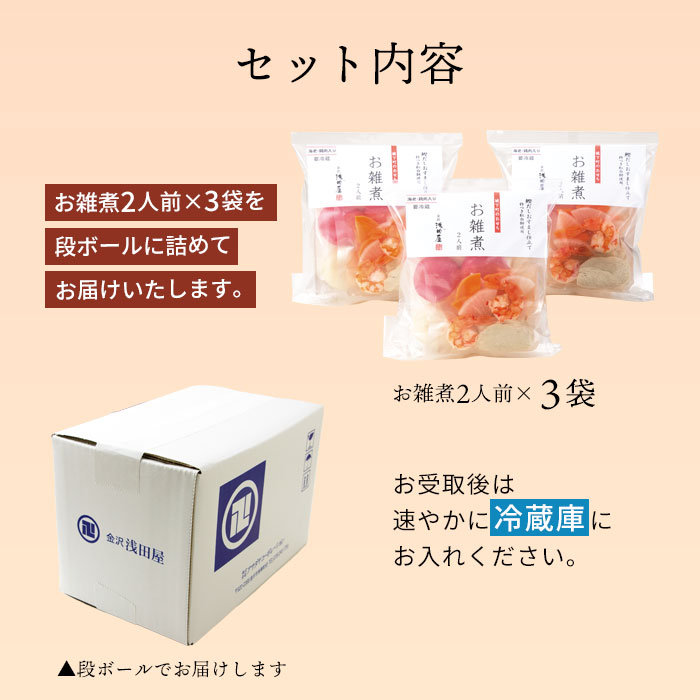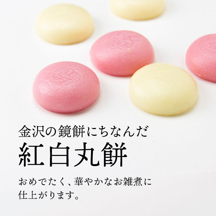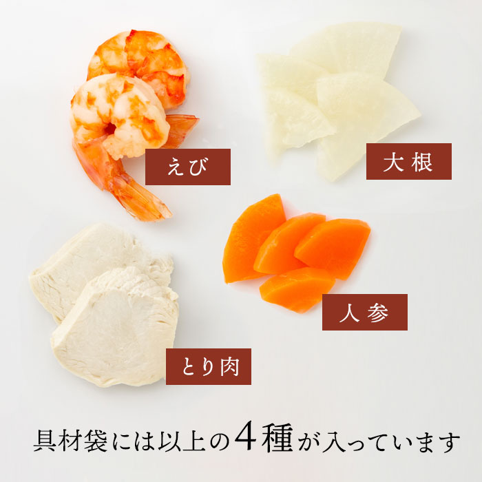 [もち]もち米(石川県産)、塩/コチニール色素 [具]えび(インドネシア産)、鶏肉、大根、人参、塩、酒、味醂、醤油、砂糖、風味原料(鰹節、昆布)、(一部にえび・小麦・大豆・鶏肉を含む) [だし]塩(国内製造)、酒、味醂、醤油、砂糖、風味原料(鰹節、昆布)、(一部に小麦・大豆を含む) |
