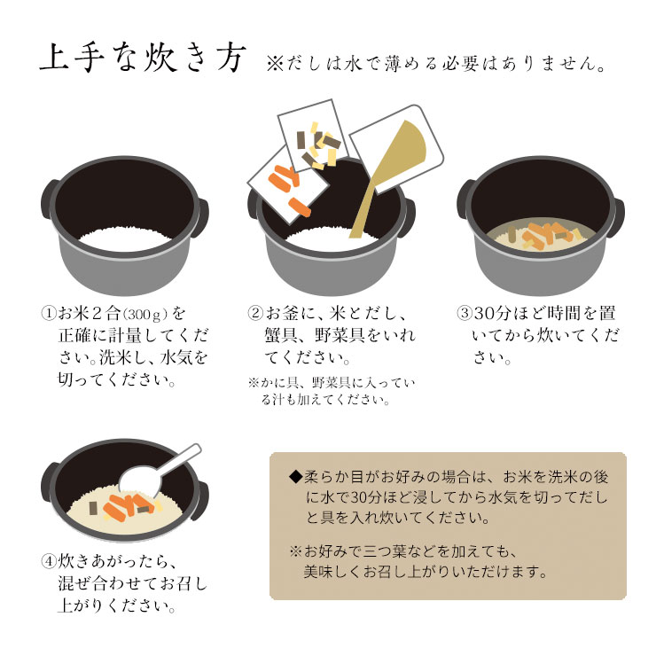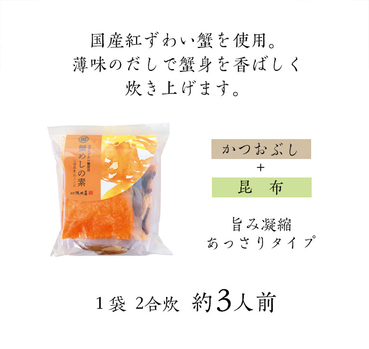 | 原材料 | [かに具]かに(国産)、植物油脂、酒、風味原料(鰹節、昆布)、(一部にかにを含む) [野菜具]野菜(筍、椎茸)、風味原料(鰹節、昆布) [だし]醤油、塩、砂糖、味醂、カキエキス、風味原料(鰹節、昆布)、(一部に小麦・大豆を含む) |